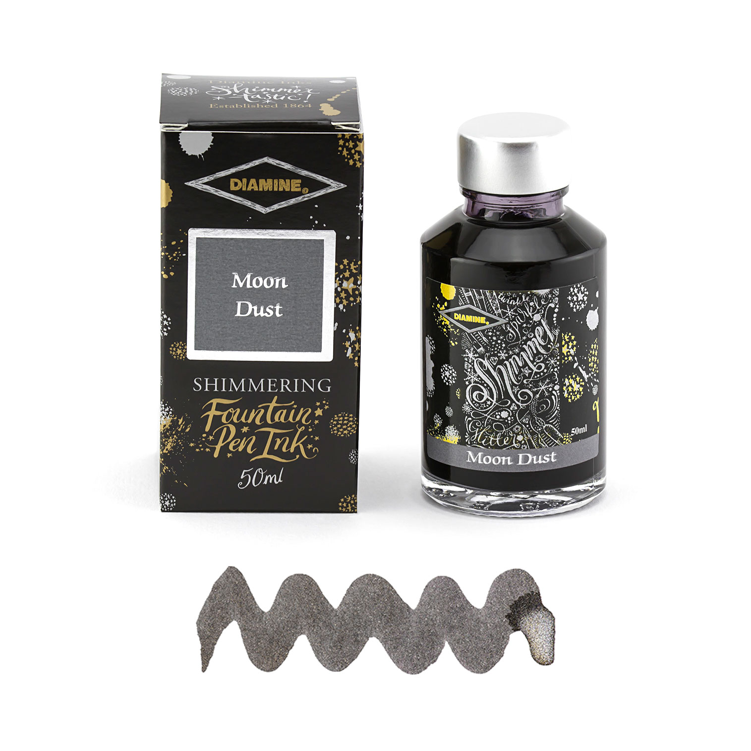 La Diamine Moon Dust associe un gris raffiné à des particules argentées qui créent un effet lumineux subtil et moderne. Idéale pour la correspondance élégante, les projets créatifs ou l’écriture quotidienne avec une touche d’originalité.