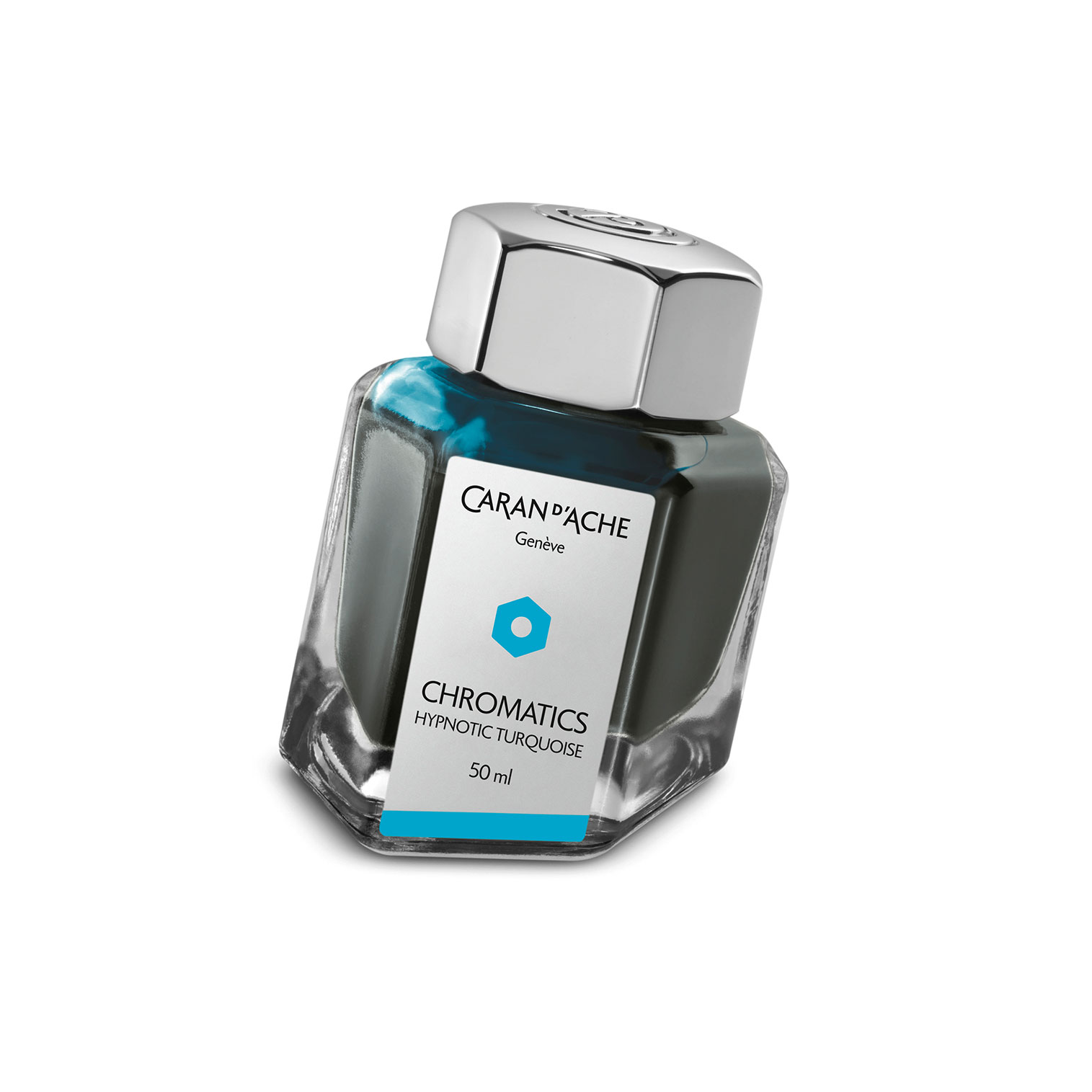 Le Flacon d'encre Caran d'Ache Chromatics - Hypnotic Turquoise 50 ml allie élégance suisse et design moderne. Une teinte turquoise éclatante et vivifiante, dans un flacon prisme hexagonal en verre. Capuchon finition métal, pour des écrits frais et captivants.