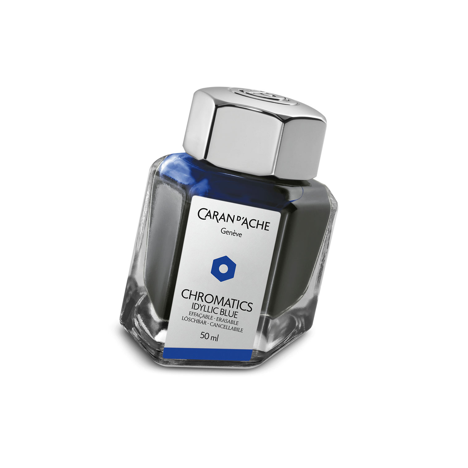 Le Flacon d'encre Caran d'Ache Chromatics - Idyllic Blue 50 ml allie élégance suisse et design moderne. Une teinte bleue douce et lumineuse, dans un flacon prisme hexagonal en verre. Capuchon finition métal, pour des écrits fluides et sereins.