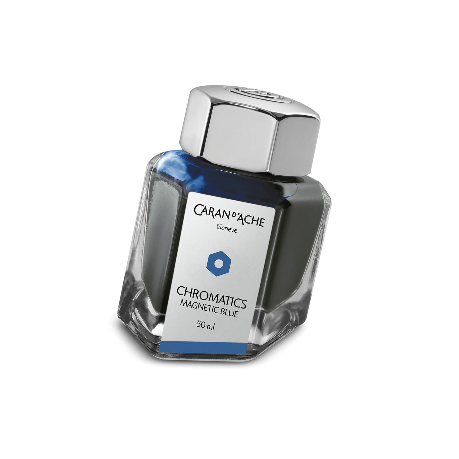 Le Flacon d'encre Caran d'Ache Chromatics - Magnetic Blue 50 ml allie élégance suisse et design moderne. Une teinte bleue profonde et vibrante, dans un flacon prisme hexagonal en verre. Capuchon finition métal, pour des écrits puissants et captivants.