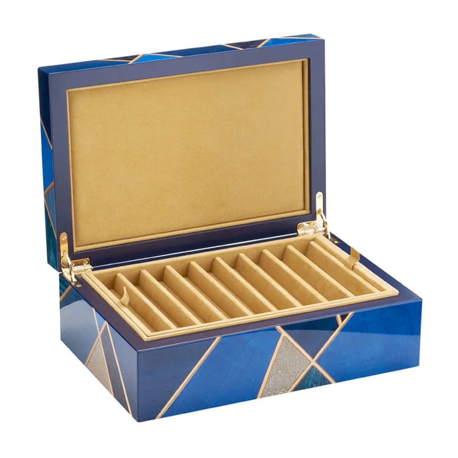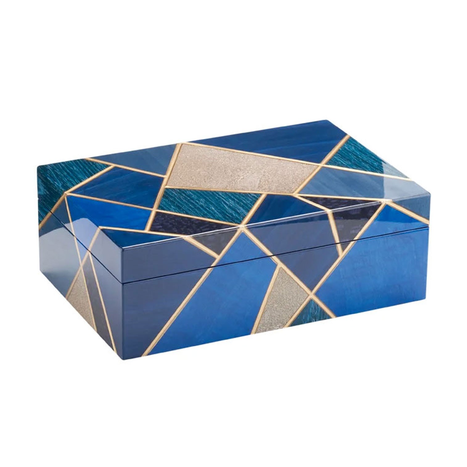 Fabriqué à la main en acajou, rehaussé de placages incrustés et de lignes géométriques dorées, ce coffret incarne l'élégance contemporaine et l’héritage artisanal italien. Sa finition brillante en polyester brossé sublime les nuances boisées et accentue la richesse des incrustations.