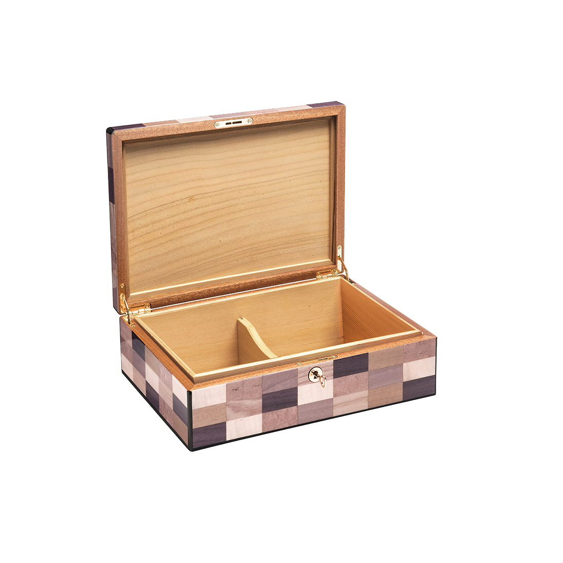Structure: Acajou, cèdre, placage incrusté, métal galvanisé couleur or rose. Emballage: Boîte en carton ondulé avec protections internes. L'esthétisme de ces coffrets " Venezia " fait écho aux légendaires costumes du carnaval de Venise. Une succession de touches de couleurs harmonieusement assemblées, confèrent à ces coffrets un aspect remarquable. Revêtement intérieur en tissu façon alcantara. Emballage: Boîte en carton ondulé avec protections internes.