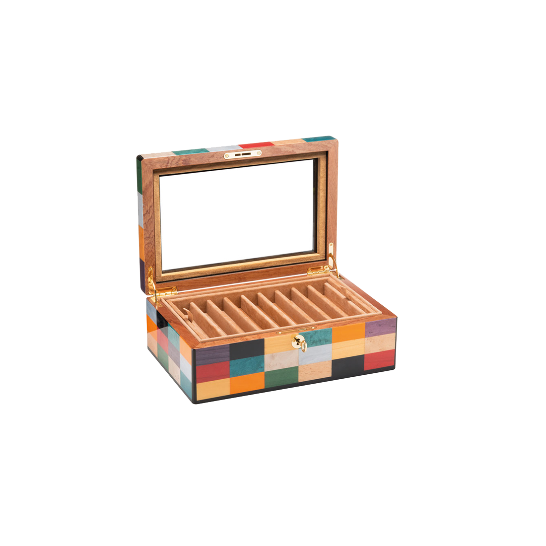 L'esthétisme de ces coffrets " Venezia " fait écho aux légendaires costumes du carnaval de Venise. Une succession de touches de couleurs harmonieusement assemblées, confèrent à ces coffrets un aspect remarquable. Revêtement intérieur en tissu façon alcantara. Emballage: Boîte en carton ondulé avec protections internes.