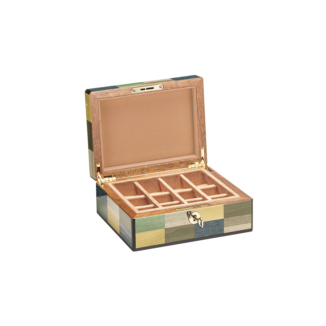 L'esthétisme de ces coffrets " Venezia " fait écho aux légendaires costumes du carnaval de Venise. Une succession de touches de couleurs harmonieusement assemblées, confèrent à ces coffrets un aspect remarquable. Revêtement intérieur en tissu façon alcantara. Emballage: Boîte en carton ondulé avec protections internes.