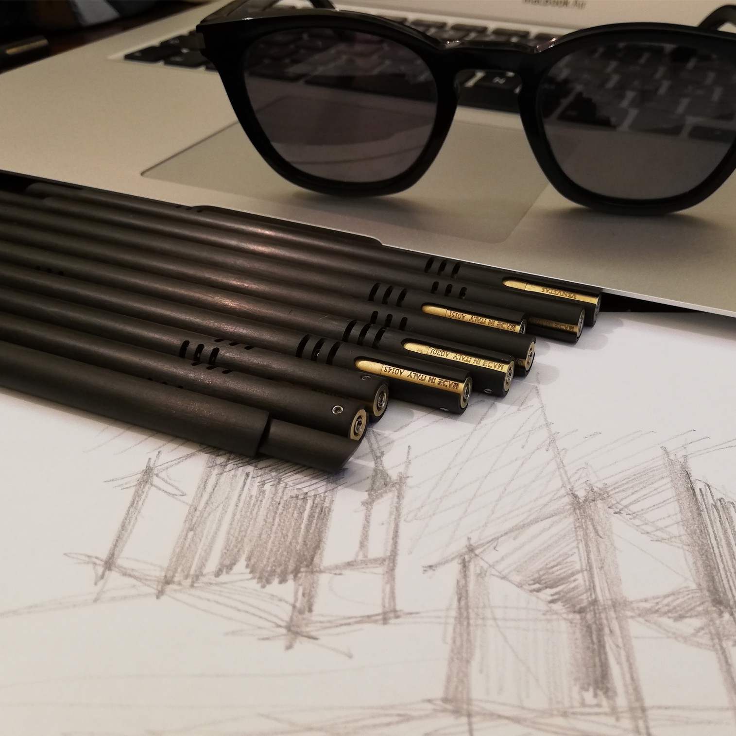 Portemines composé d'un corps en fibre de carbone linéaire poncée à la main. Structure en acier inoxydable - laiton sans plomb.