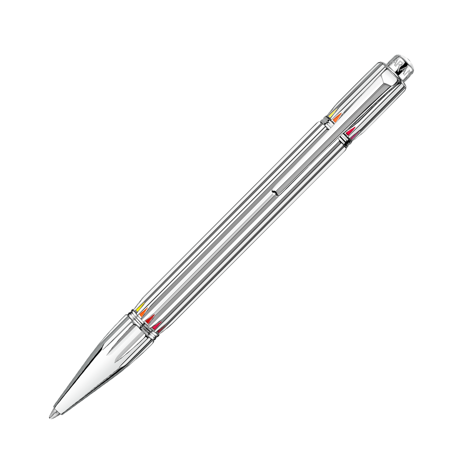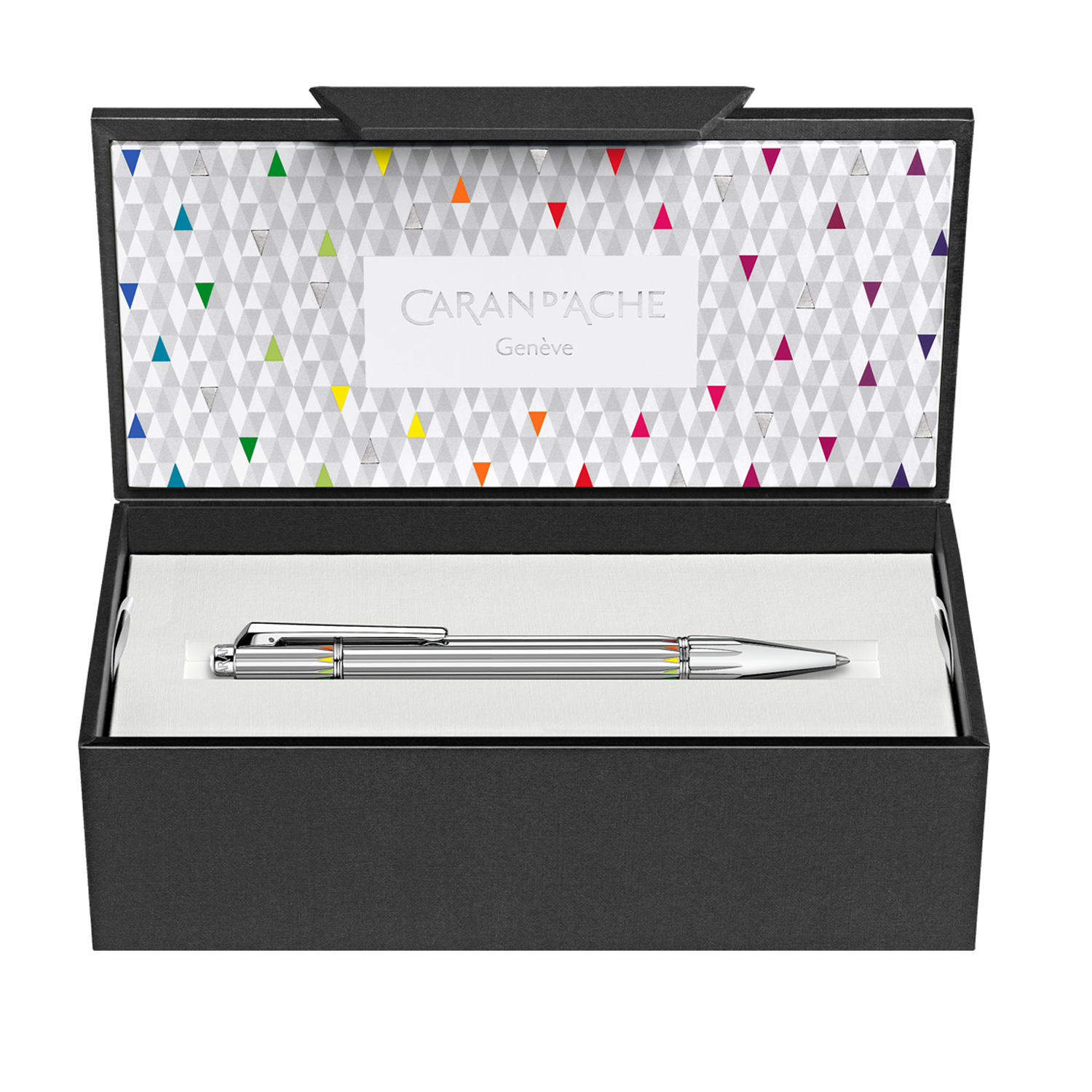 Le corps du stylo bille, en argenté rhodié, révèle un guillochage horloger effet couronne, composé d’un cylindre facetté aux fins triangles gravés. Chacun d’eux est délicatement laqué à la main par les maîtres-artisans de la Maison, déployant progressivement les 12 couleurs du cercle chromatique Caran d’Ache. Une prouesse artisanale où précision, patience et maîtrise des pigments donnent naissance à une harmonie visuelle unique.