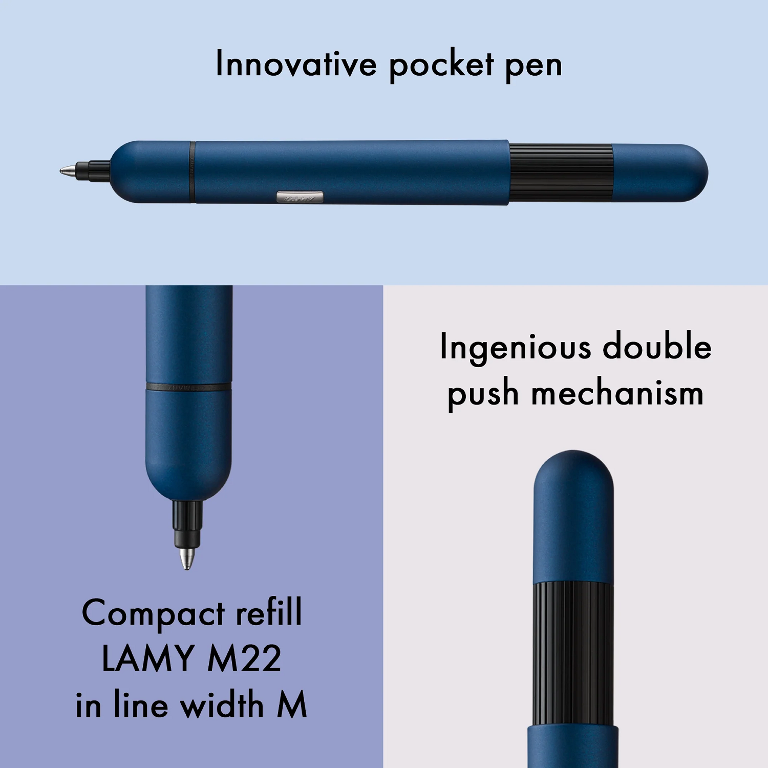 Sa robe bleu nuit lui confère une élégance sobre et contemporaine, tandis que son format mini (124 mm) permet de l’emporter partout : trousse, veste, sac ou poche. Équipé d'une recharge compacte LAMY M 22 noire, il offre une expérience d’écriture fluide et fiable.