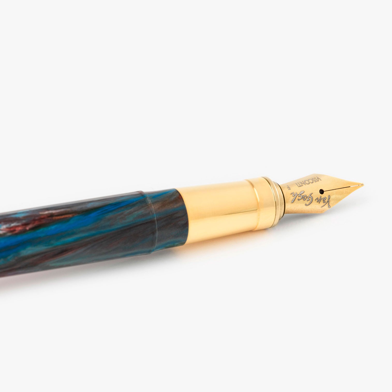 La forme emblématique des stylos Van Gogh provient du facettage spécial à 18 faces du corps et du capuchon. Ce type de fabrication donne au stylo un effet dynamique qui rappelle les coups de pinceau de Vincent Van Gogh. Pour cette édition spéciale de la collection Van Gogh, les attributs dorés ont été choisis pour créer un jeu de contrastes avec les résines colorées et métalliques qui composent le stylo.