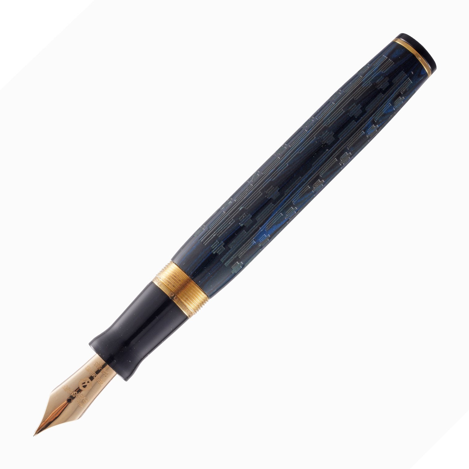 Chaque stylo est méticuleusement élaboré, intégrant un mécanisme de remplissage à piston de pointe et une plume Moyenne en or massif 14 carats, offrant une expérience d'écriture fluide et raffinée. Le corps en ébonite marbrée bleue, orné d’un somptueux motif Art Déco en guilloché, incarne la rencontre parfaite entre l'élégance d'hier et la technique d'aujourd'hui.
