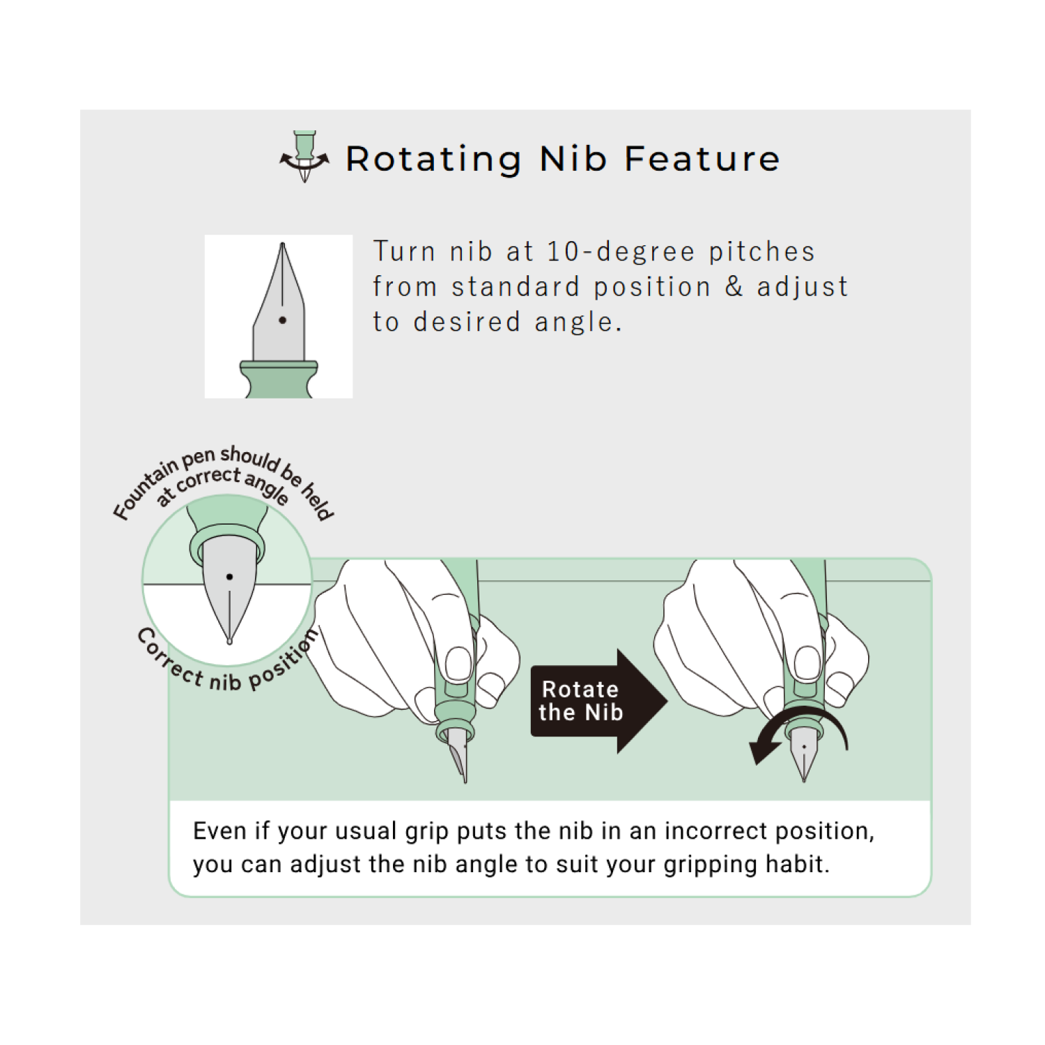 La plume peut être inclinée jusqu’à 10 degrés pour s’adapter à votre angle d’écriture naturel. Vous n’avez plus à vous ajuster au stylo, c’est lui qui s’adapte à vous.