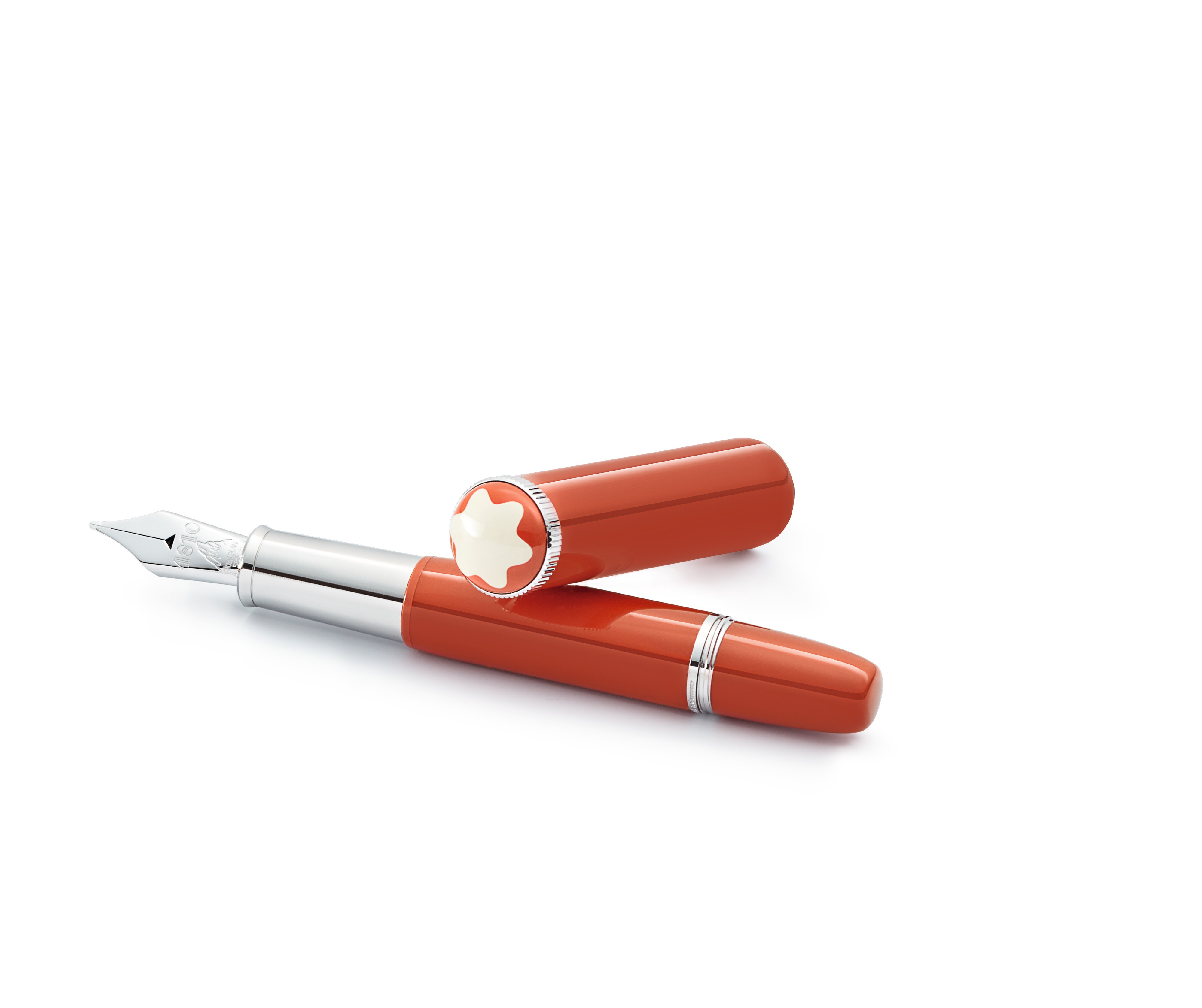 Stylo plume Montblanc Heritage « Baby » corail. Laque précieuse et attributs platinés, format compact. Plume fine en or 14 K gravée du Mont Blanc. Un hommage raffiné aux stylos des années 1920.