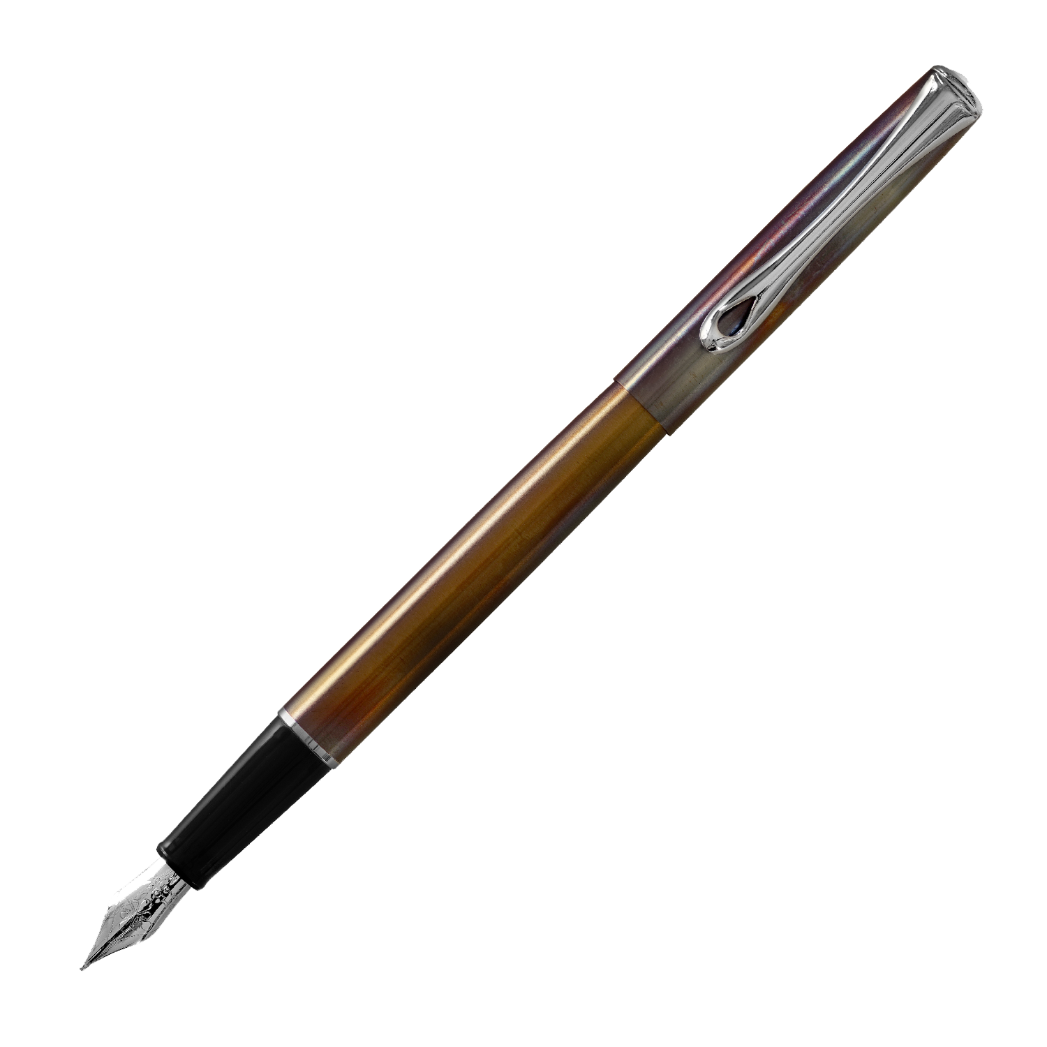Le Stylo Plume Diplomat Traveller Flame se distingue par sa finition spectaculaire, flammée à la main, qui rend chaque pièce absolument unique. Ce traitement artisanal de l’acier inoxydable révèle des nuances profondes et changeantes, faisant de chaque stylo un objet singulier.