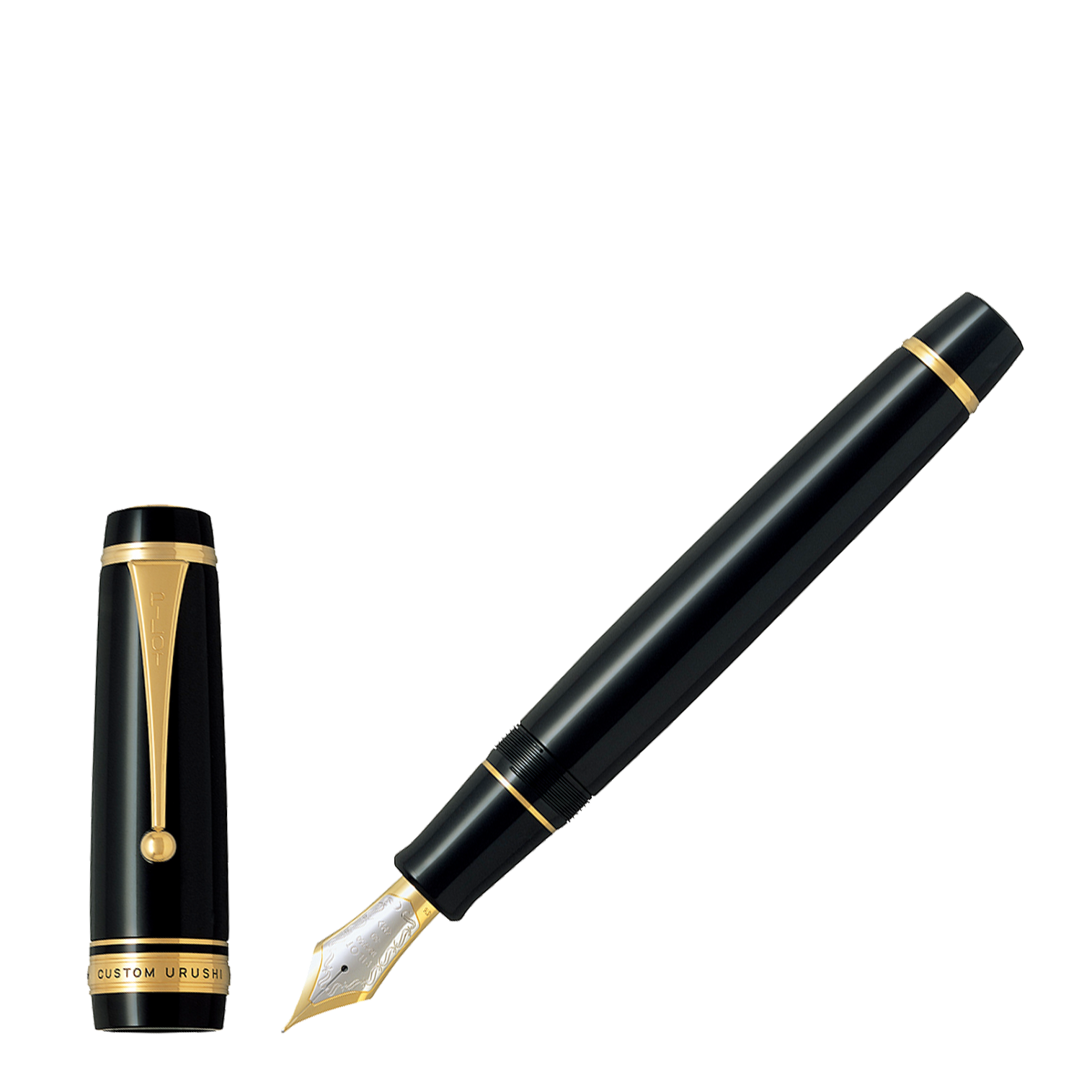Sur ce Pilot Custom Urushi, la profondeur du noir brillant est encore soulignée par l'agrafe plaquée or, simple, marquée « Pilot » et se terminant par une boule qui facilite l'introduction en poche, et les attributs du même métal. Le capuchon est ample et s'évase vers le bas. Il comporte une bague bordée de deux rainures qui renforce sa lèvre. Une fine bague la surplombe. Le sommet du capuchon est surmonté d’une pastille plaquée or et, tout près, d’une bague rainurée sous laquelle s'insère l'agrafe. L'extrémité inférieure du corps reçoit également une bague comportant une rainure. L'ensemble est élégant, même si on pourra préférer la sobriété d'un Empereur, qui ne comporte aucune bague…