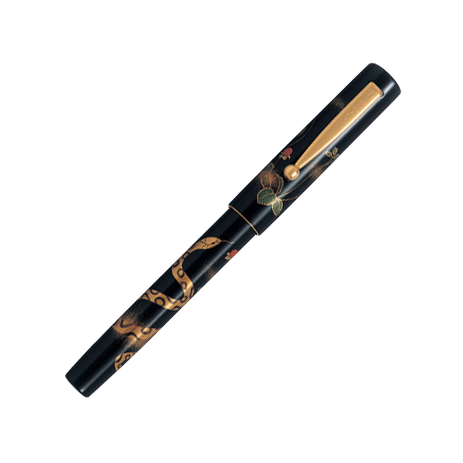 Conçu par Riki Nakamachi, l’un des plus grands maîtres de la peinture traditionnelle japonaise, ce stylo illustre avec finesse le serpent, accompagné d’une plante choisie pour sa proximité phonétique avec le mot “serpent” en japonais – un jeu de mots subtil et poétique propre à la culture nippone. L’animal, finement détaillé, semble glisser avec grâce sur le corps du stylo, dans un mouvement fluide et vivant, amplifié par les reflets irisés de la laque.