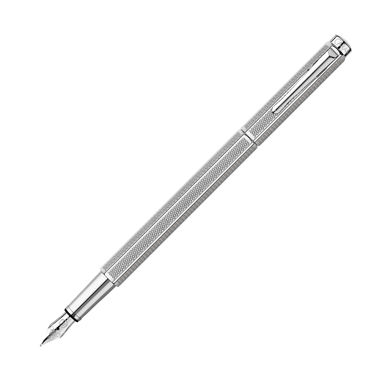 Le Stylo Plume Ecridor Rétro Platiné de Caran d'Ache allie design vintage et précision suisse. Corps en laiton platiné, guillochage losanges gravé au diamant, bec de plume Moyen en acier rhodié. Présenté dans un écrin standard élégant.