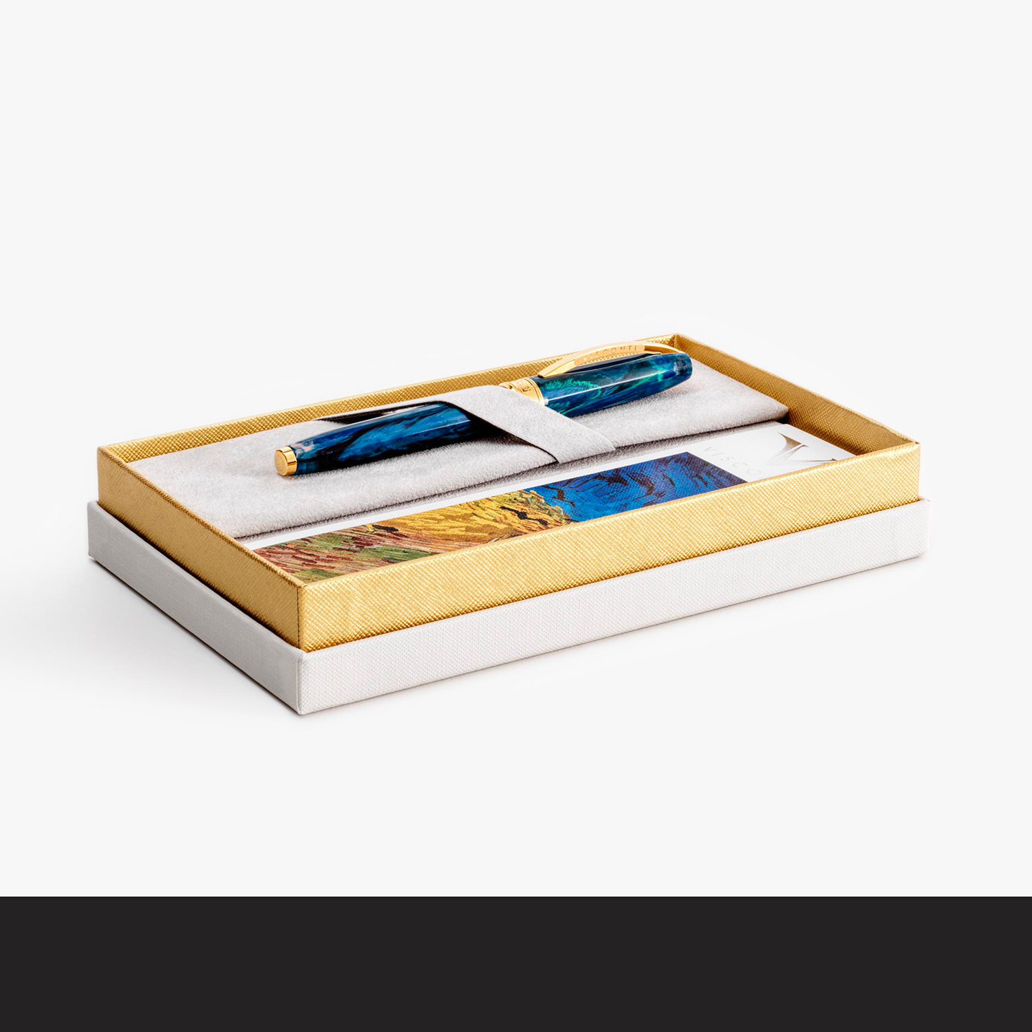 La forme emblématique des stylos Van Gogh provient du facettage spécial à 18 faces du corps et du capuchon. Ce type de fabrication donne au stylo un effet dynamique qui rappelle les coups de pinceau de Vincent Van Gogh. Pour cette édition spéciale de la collection Van Gogh, les attributs dorés ont été choisis pour créer un jeu de contrastes avec les résines colorées et métalliques qui composent le stylo.