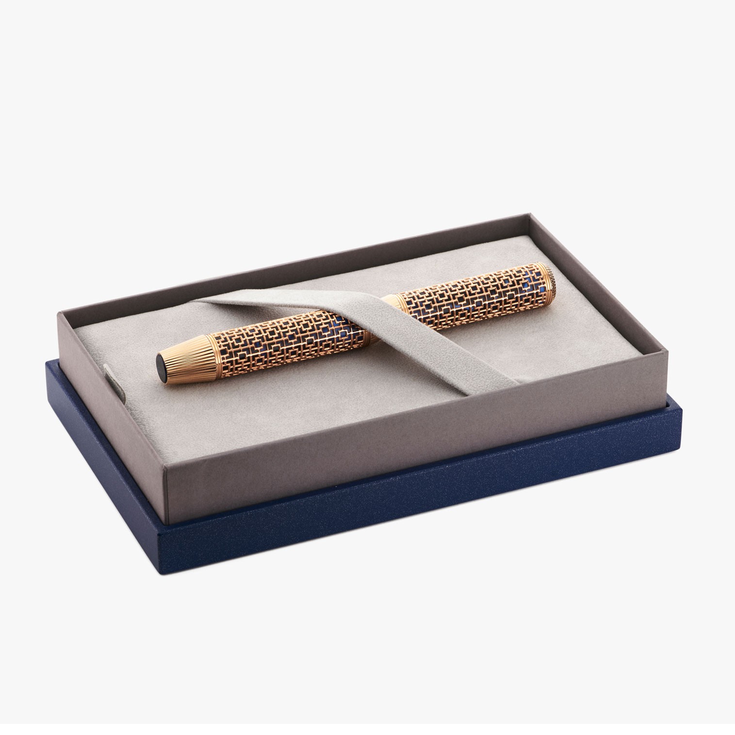 Plus qu'un simple outil d'écriture, la collection Looking East témoigne du riche héritage du design asiatique et du lien profond entre l'architecture, l'identité et l'artisanat. Disponible en 188 exemplaires dans le monde entier. La collection Looking East présente un design captivant, avec son filigrane qui orne le corps du stylo dans un fascinant motif quadrillé répété. La plume plaquée or 18 carats, réalisée par les artisans de Visconti, s'harmonise parfaitement avec le design de ce prestigieux instrument d'écriture : un précieux filigrane d'argent sterling recouvert d'un brillant plaquage or rose. Fabriqué à la main par des artisans italiens, chaque carré filigrané qui recouvre ce précieux stylo roller est finement gravé à partir d'un cylindre d'argent ensuite recouvert d'un élégant or rose. Cette Collection représente l'hommage de Visconti à la culture asiatique séculaire et au lien profond entre l'architecture, l'identité et l'artisanat.