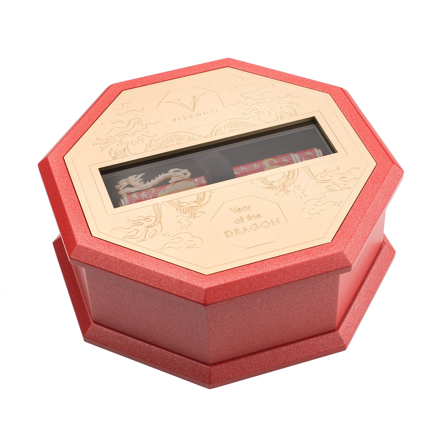 L’Année du Dragon capture la beauté majestueuse et l’élégance des traditions chinoises tout en mettant en valeur l’habileté artisanale et la créativité des artisans de Visconti. Le dragon symbolise la force, le courage, la créativité et l’innovation dans la culture chinoise. Ce stylo en argent plaqué or est finement gravé d’un dragon chinois à cinq griffes. Le dragon est mis en valeur sur un fond rouge, une couleur traditionnellement porte-bonheur. Pour accentuer son pouvoir et sa noblesse, un rubis précieux est incrusté dans l’œil du dragon impérial sur le corps du stylo. Même le détail du clip représente un dragon chinois doré volant haut au-dessus des nuages. La fermeture du capuchon est à vis. Le roller utilise la recharge Visconti A40. L’écrin du stylo, inspirée de la culture d’Extrême-Orient, rappelle les structures octogonales des pagodes chinoises. La couverture de la boîte présente une gravure élaborée sur fond d’or représentant le dragon impérial. Édition Limitée à 224 pièces pour le monde entier.