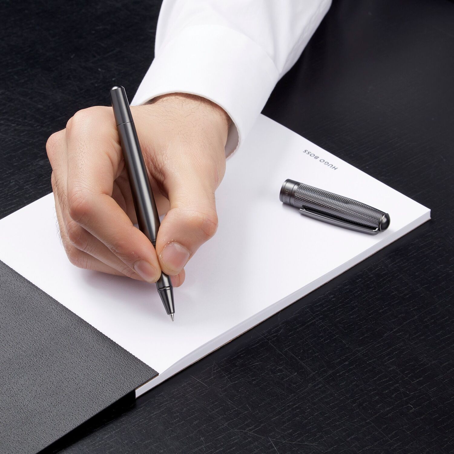 Le Stylo Roller Hugo Boss Essential – Metal Gun revisite une ligne emblématique avec une esthétique plus profonde et audacieuse. Sa silhouette légèrement affinée offre une prise en main ergonomique et une sensation d’équilibre parfaite.