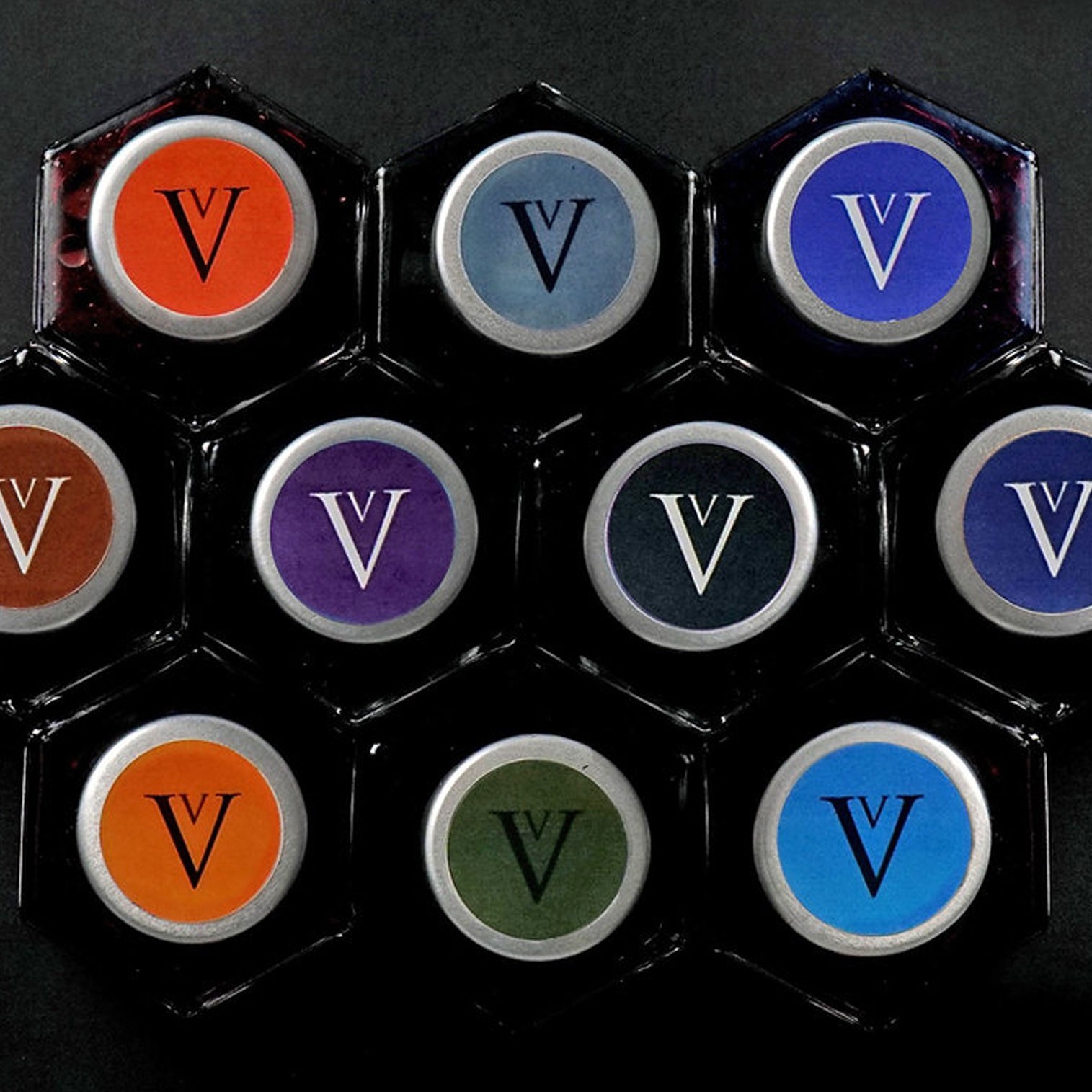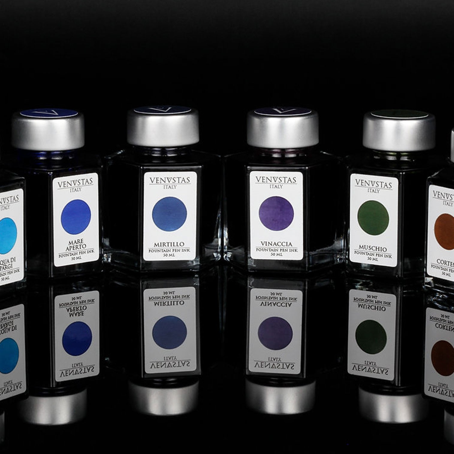 La gamme d'encres Venvstas commence avec une sélection de 10 couleurs spécialement formulées pour les stylos-plume. Elles sont mélangeables, de qualité supérieure, avec un nouvel emballage distinctif qui est 100 % recyclable. La bouteille en verre est munie d'un bouchon en aluminium étanche pour réduire au maximum l'utilisation du plastique. livrée dans des boîtes en carton noir. Bouteilles de 50 ml / 1,7 fl oz US.